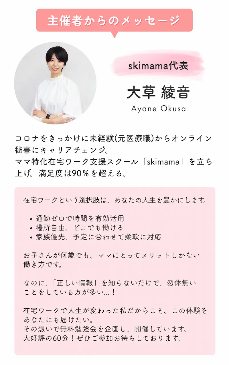 だからこそ、勉強会のテーマである「たった60分で在宅ワークデビューが目指せる!」は誇張ではありませんし、きっとあなたも満足いただけるはずです!